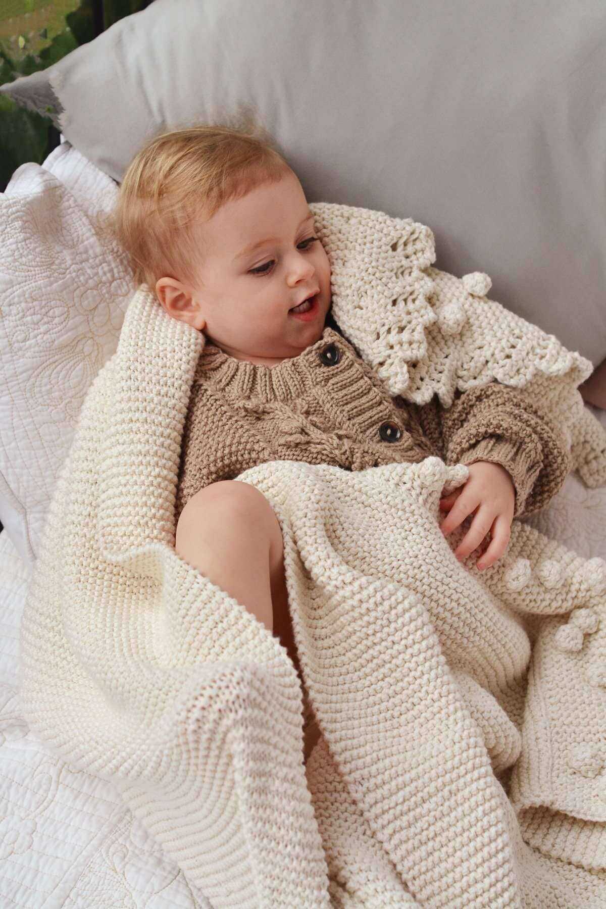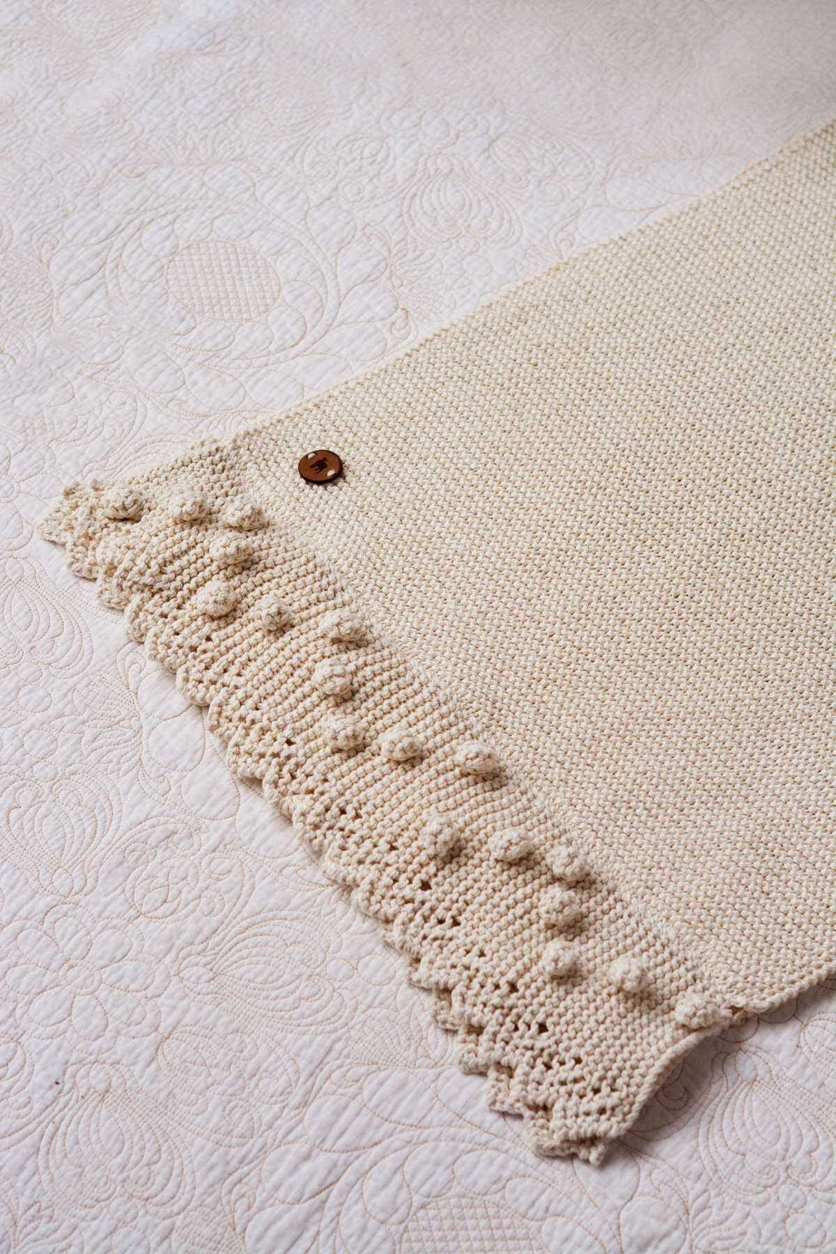 Our Eco-cotton wrap with detailed bobble lace edge. An elegant and practical ‘cocoon of cuddlinessโ to embrace Mother and Child.