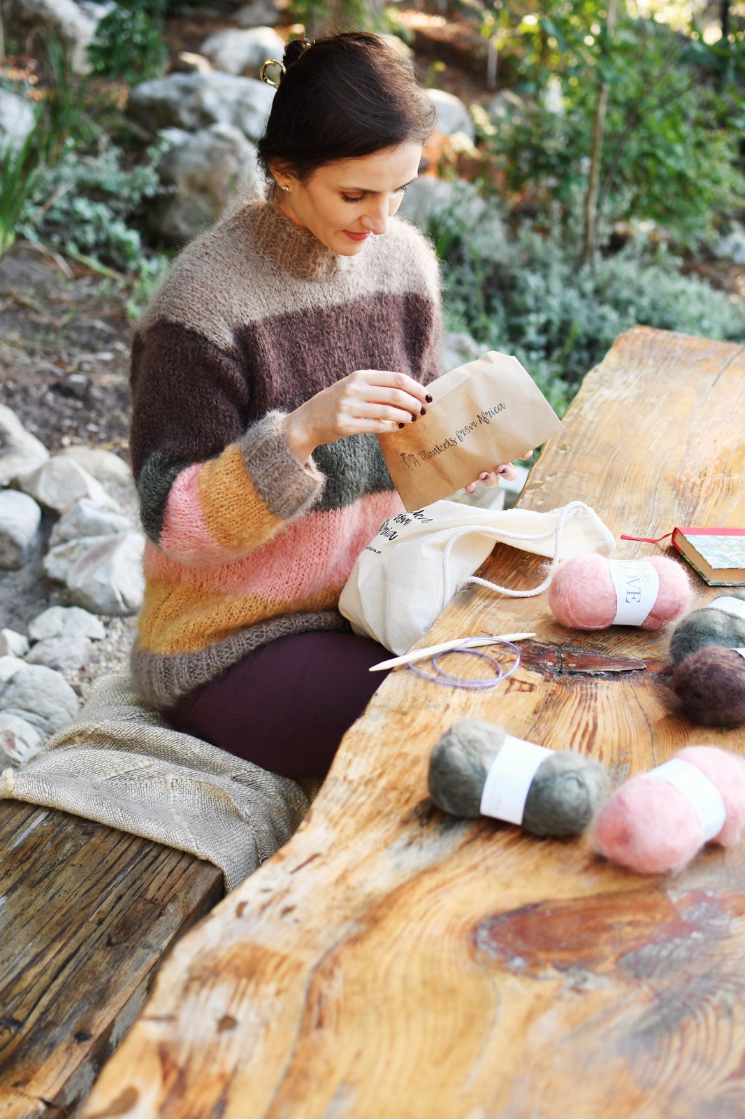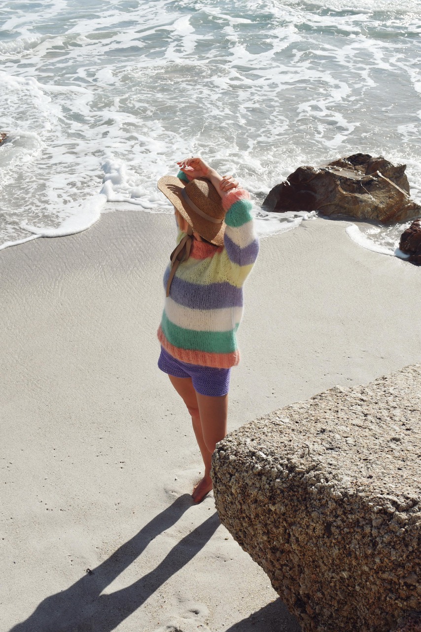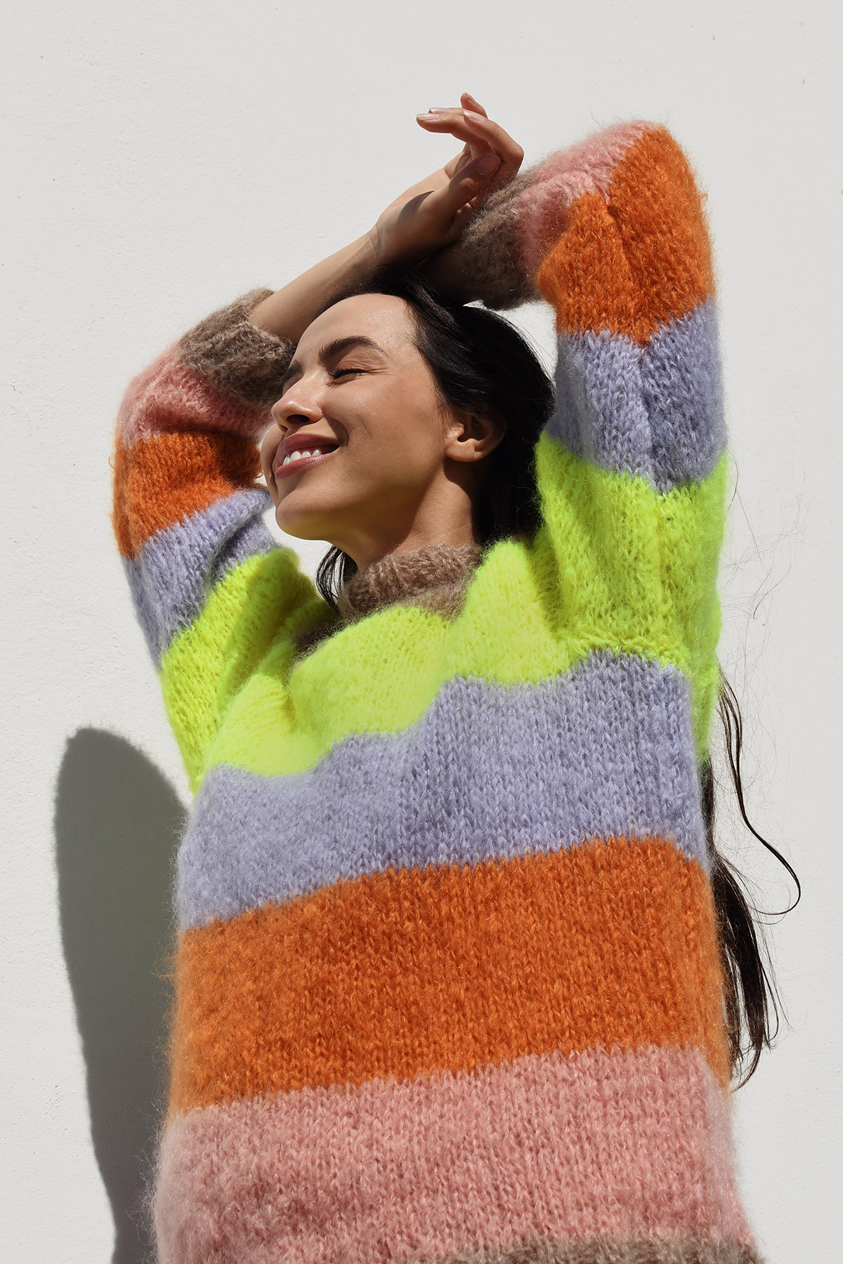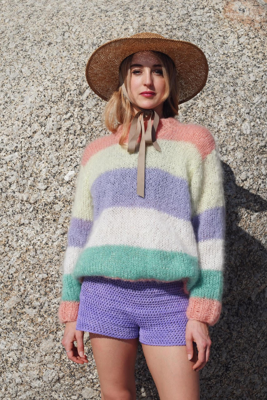 The Alexandra Pullover is of the finest mohair yarn from the Karoo in vibrant and fun stripes. Mohair breathes, absorbing and releasing atmospheric moisture and controlling its own “climate” to ensure optimal comfort. It is inherently flame resistant.